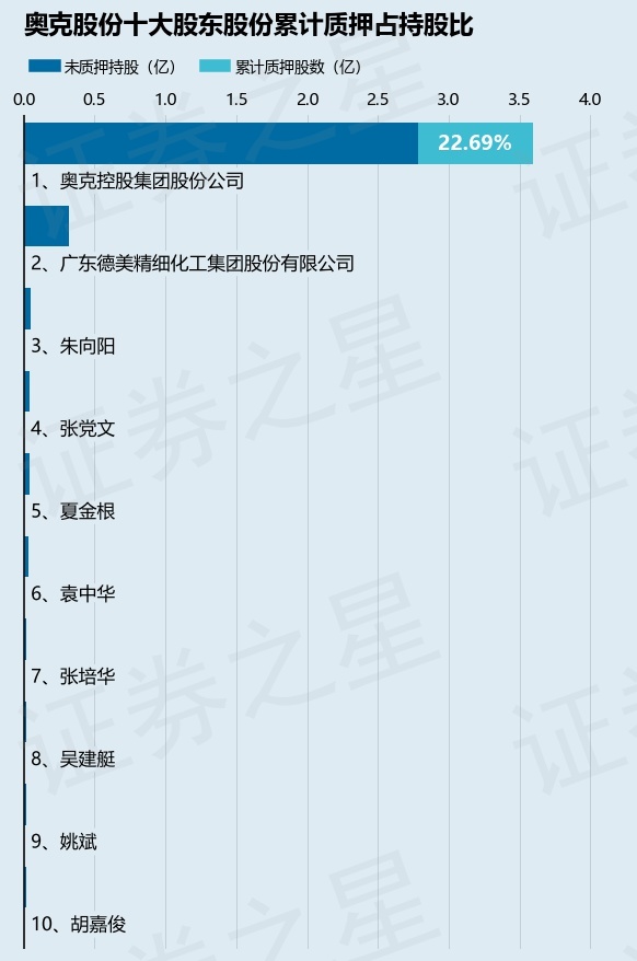 截止本公告日,股东奥克控股集团股份公司已累计质押股份8161.75万股,占其持股总数的22.69%。本次质押后奥克股份十大股东的累计质押股份占持股比例(占持股比例的计算以公司最新一期财务报表公布的十大股东的持股总数为基准)见下图: